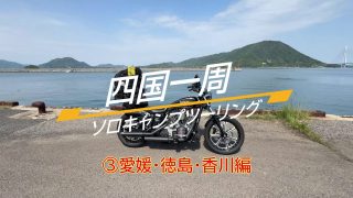 四国一周ソロキャンプツーリングの3日目は、桂浜で坂本龍馬像を見て、与作狸、白龍湖に立ち寄り、天狗高原を通り四国カルストで記念撮影。四万十川の沈下橋である高瀬橋により、四国最南端の足摺岬に行きました。雨の降る中走り続け須ノ川公園キャンプ場に宿泊しました。