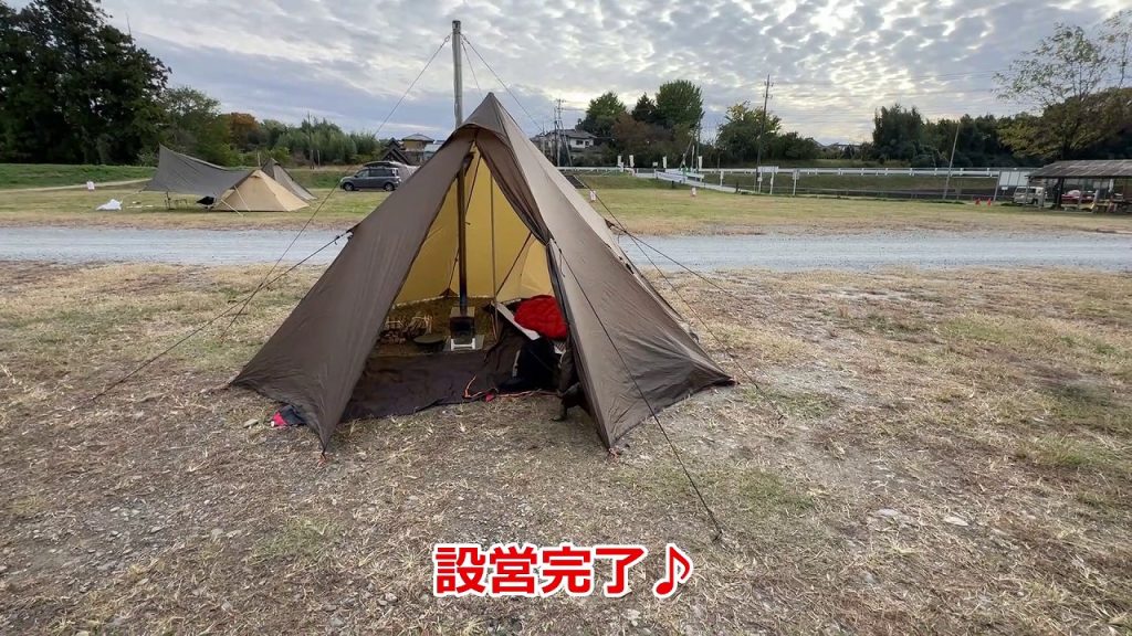 嘘です。このテント張るのが久しぶりすぎて、綺麗に張るために何度もペグ打ち直してます。