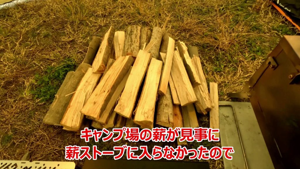 キャンプ場で購入した薪が微妙に長く、見事に薪ストーブに入りません(´Д`)