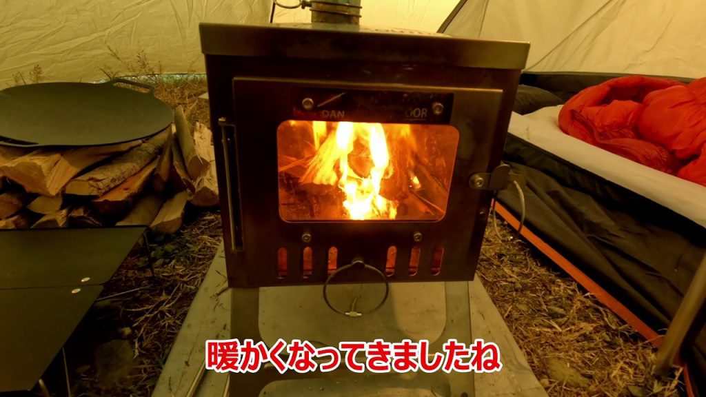 薪ストーブに火が入ると、徐々にテントが暖かくなってきました(^^♪