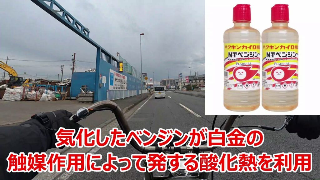 ハクキンカイロはベンジンを中の綿にしみこませ、ライターで加熱することで、気化したベンジンが白金(プラチナ)の触媒作用によって発する酸化熱を利用して温めます。