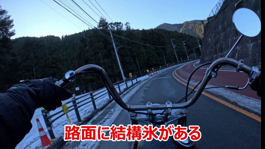 しばらく走っていると、路面に氷が残ってます(;’∀’)