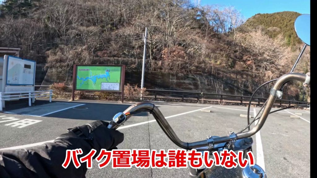 なんとか奥多摩湖のバイク置場へ到着。
